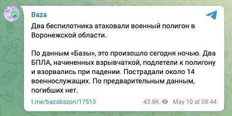 «Два безпілотники атакували військовий полігон у Воронезькій області. Це сталося сьогодні вночі», сказано в повідомленні.