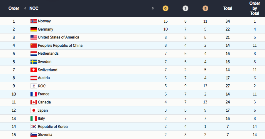 За два дні до закінчення Олімпіади-2022 Норвегія встановила новий абсолютний рекорд за кількістю золотих медалей – 15. Це вже більше на одну медаль, аніж 2018-го року – тоді норвежці та німці закінчили Ігри у Пхьончхані з 14-ма нагородами найвищої проби. Такий же показник і в збірної Канади 2010-го року.