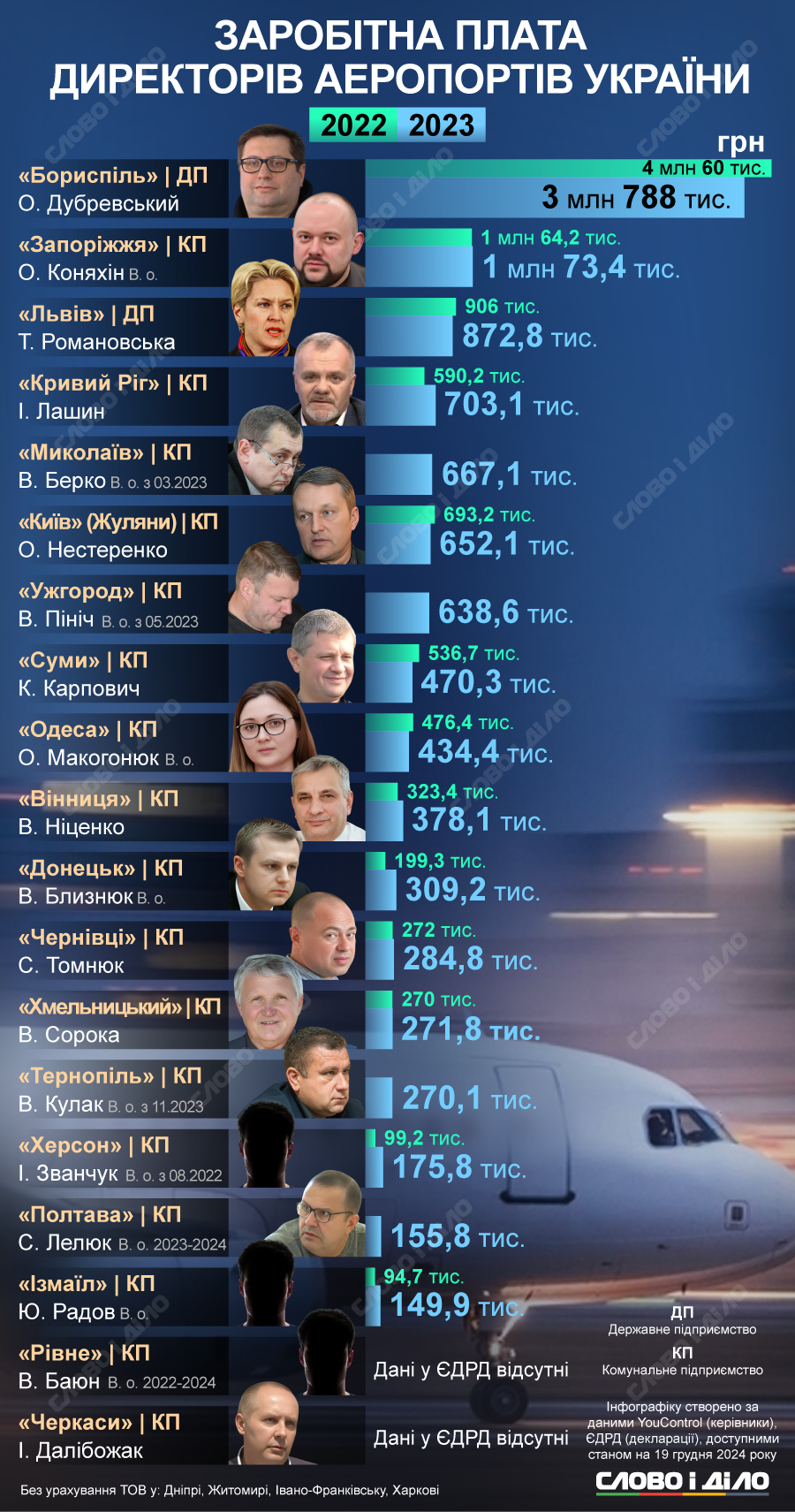 Серед директорів українських аеропортів найбільшу зарплату мав очільник «Борисполя» Олексій Дубревський – за 2023 рік він задекларував 3 млн 788 тис. грн зарплати.