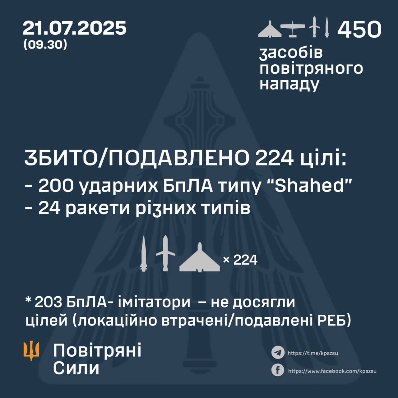 Як зазначають, у ніч на 21 липня (із 21.00 20 липня) противник атакував 450-ма засобами повітряного нападу:
