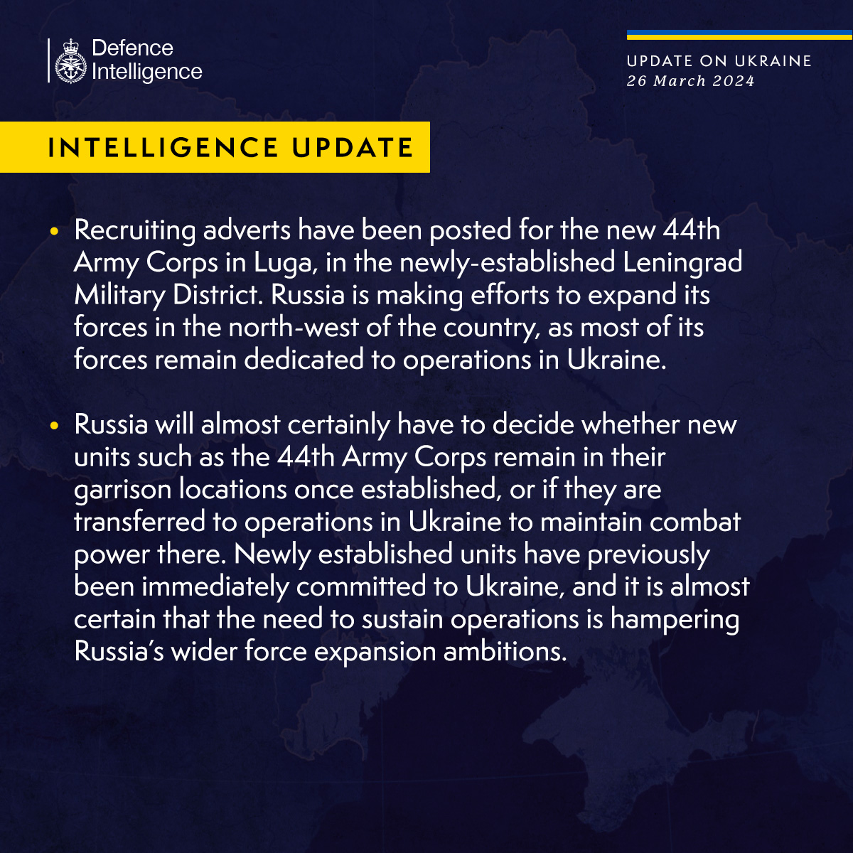 За інформацією розвідки, Росії майже напевно доведеться вирішити, чи залишаться нові підрозділи, такі як 44-ий армійський корпус, у місцях дислокації своїх гарнізонів після їх створення, чи їх переведуть для операцій в Україні для підтримки там бойової потужності.