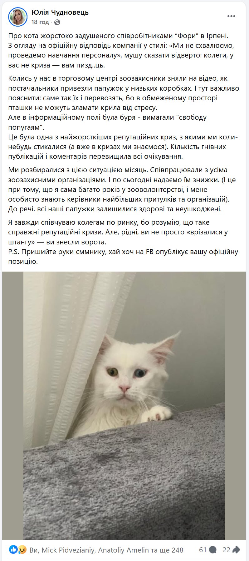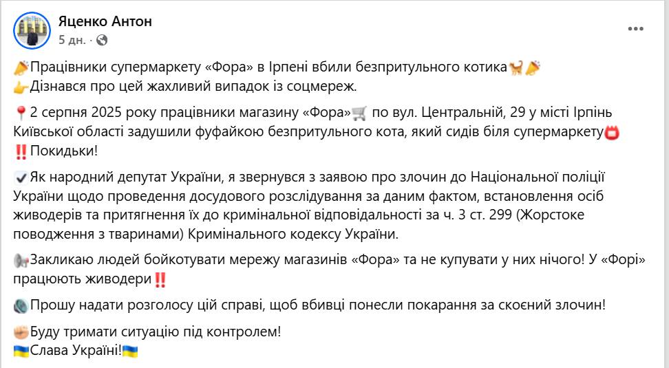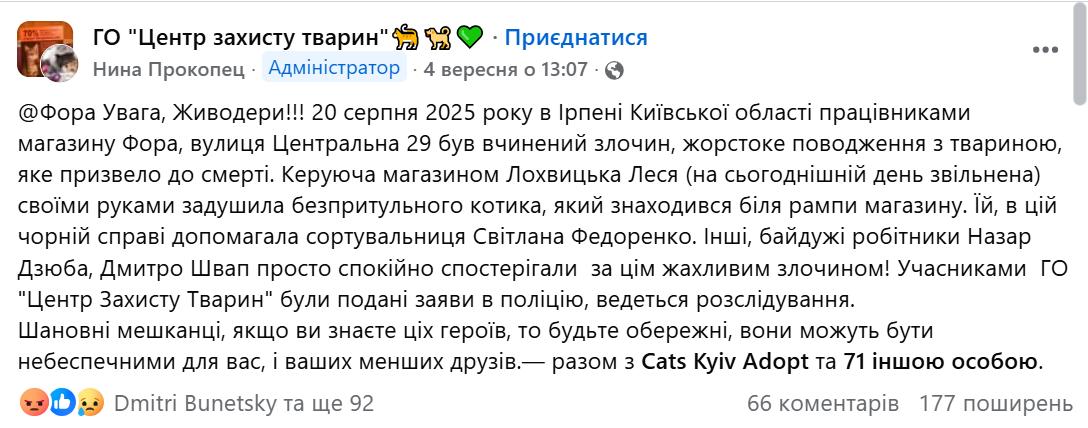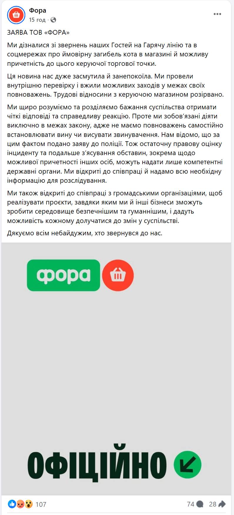 Лише після втручання прокуратури «Фора» підтвердила факт внутрішньої перевірки. Компанія розірвала трудові відносини з керуючою магазином та заявила, що готова надати всю необхідну інформацію слідчим. У заяві підкреслюється, що мережа засуджує жорстокість до тварин та планує запровадити навчання для персоналу щодо етичного поводження.
