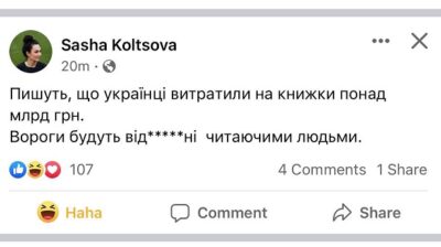 А співачка Саша Кольцова зауважує, що українці витратили на книжки понад мільярд гривень: «Вороги будуть від******ні читаючим людьми».