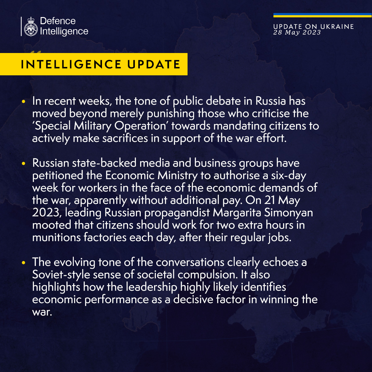 У Міністерстві оборони уточнили, що російські державні медіа та бізнес-групи звернулися до Міністерства економіки з проханням дозволити шестиденний робочий тиждень для працівників з огляду на економічні вимоги війни. Ймовірно, додаткову оплату за це не надаватимуть. При цьому 21-го травня російська пропагандистка Маргарита Симоньян закликала громадян працювати на заводах із виробництва боєприпасів по дві додаткові години щодня після своєї основної роботи.