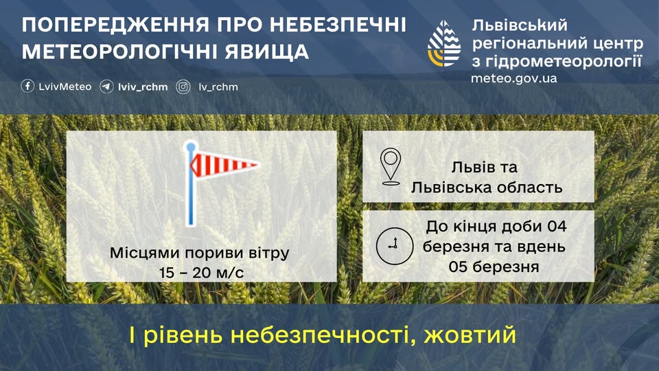 «По території Львівської області та по місту Львову: до кінця доби 04 березня та вдень 05 березня місцями пориви південно-західного вітру 15 – 20 м/с.