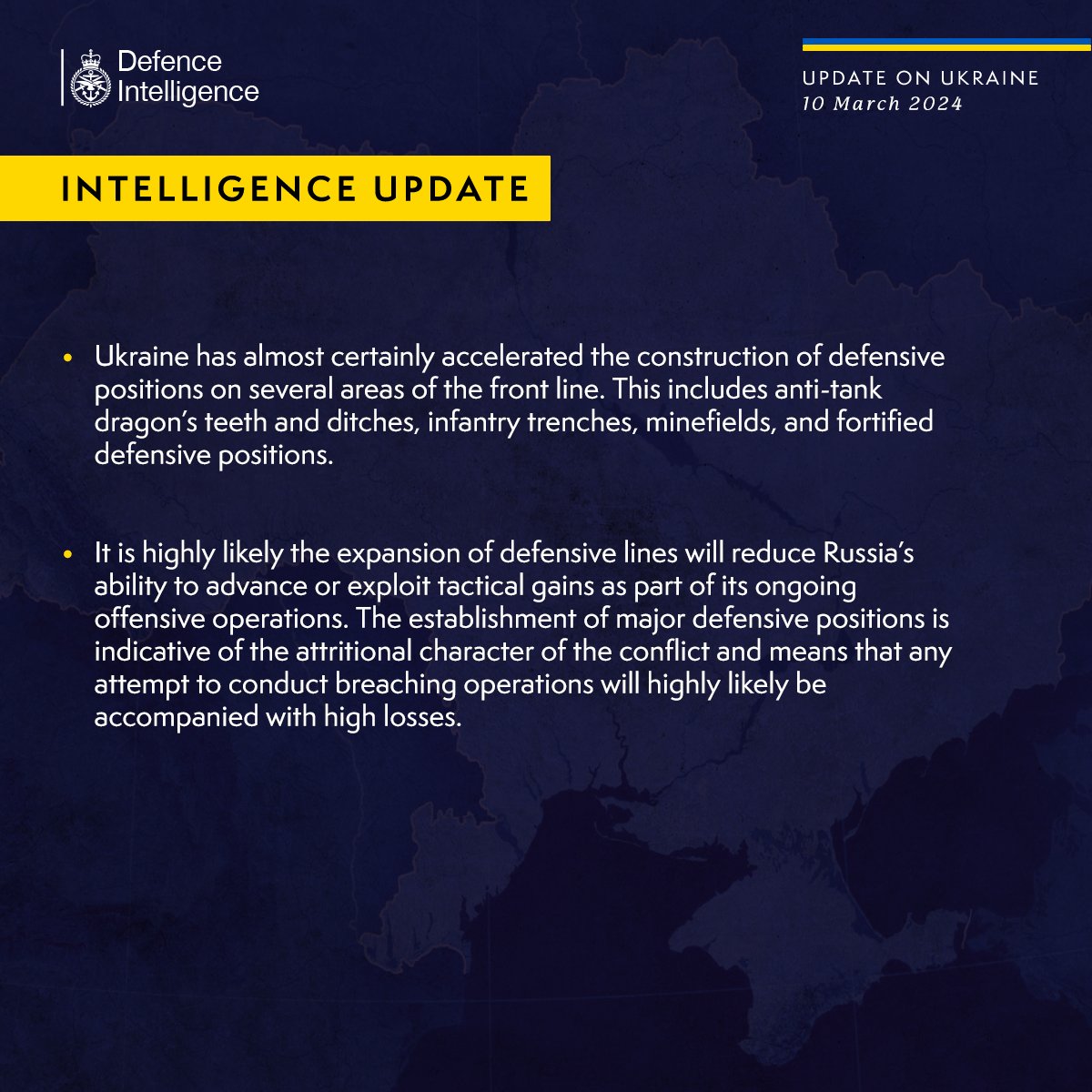 Україна прискорила будівництво оборонних позицій на декількох ділянках фронту. Це може суттєво зменшити здатність російських загарбників просуватися вперед. Такий висновок зробило Міністерство оборони Великої Британії з посиланням на дані розвідки. Британські розвідники зазначили, що до оборонних позицій українських воїнів входять протитанкові «зуби дракона», рови, піхотні окопи, мінні поля й укріплені позиції.
