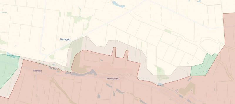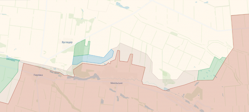 За даними карти, наші захисники змогли прорвати оборону росіян на північних околицях села Микільське, що розташоване біля Вугледара. Ворога відтіснили в районі місцевих дач, наші військові вже закріпилися там.