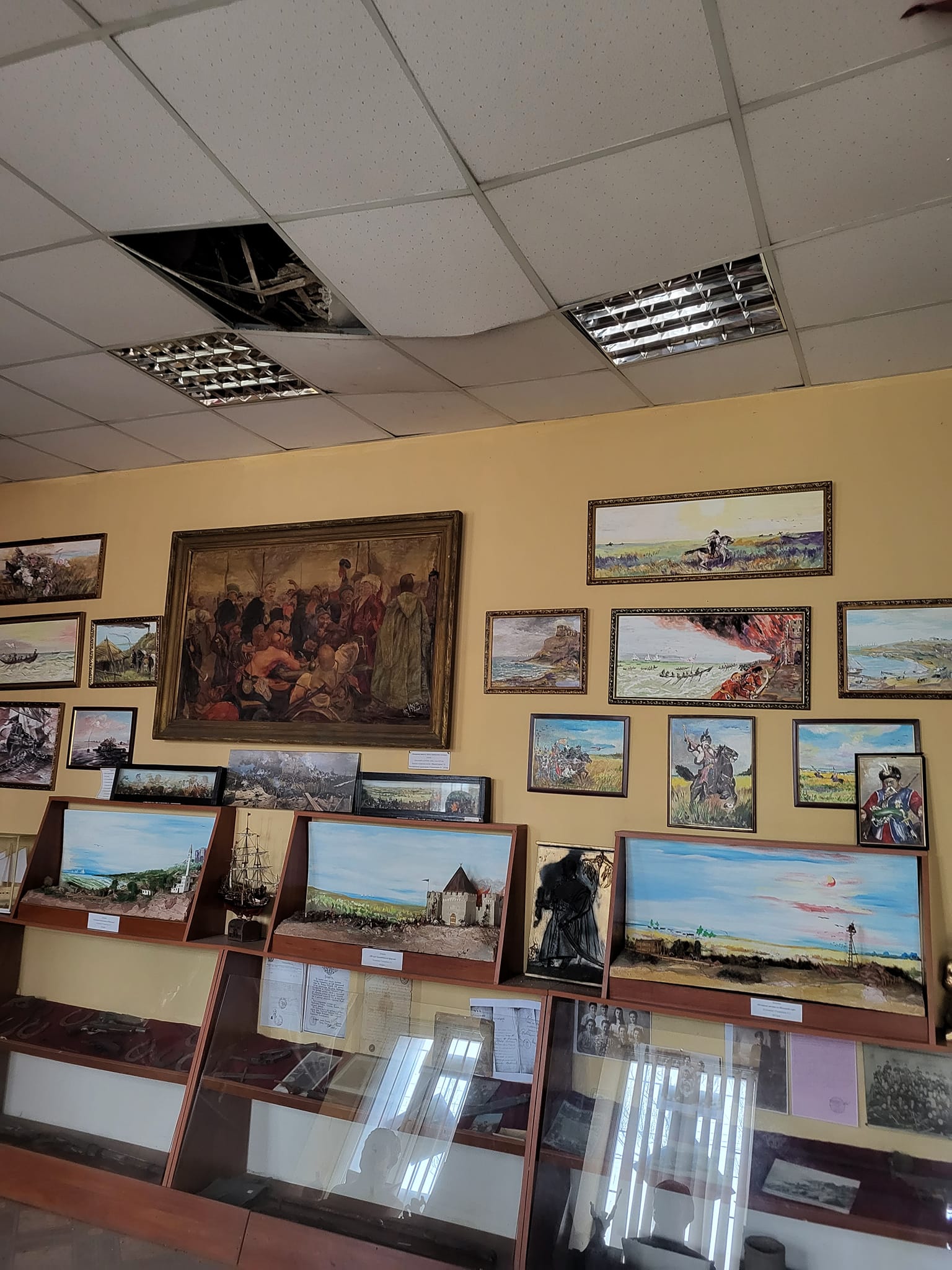 «Після нічної атаки шахедів у нас в музеї історії розвитку українського козацтва в центральній залі впала частина стелі, а та що залишилась – аварійно нависла», – зазначив він.