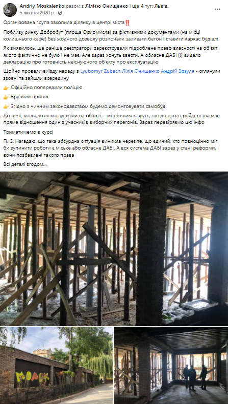 ЦИТАТА: Поблизу ринку Добробут (площа Осмомисла) за фіктивними документами (на місці колишнього кафе) без жодного дозволу розпочали заливати бетон і ставити каркас будівлі. Як виявилось, ще раніше реєстратори зареєстрували підроблене право власності на об’єкт, якого фактично не було і не має. Але зараз хочуть звести. А обласне ДАБІ (!) видало декларацію про готовність неіснуючого об’єкту про експлуатацію. Андрій Москаленко – заступник міського голови Львова.