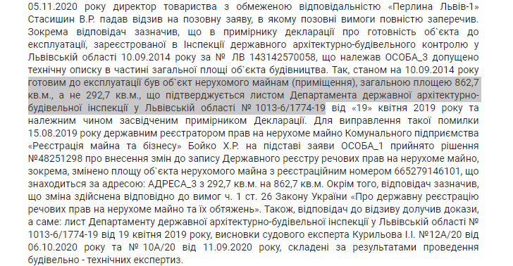 ЦИТАТА: Так, станом на 10.09.2014 року готовим до експлуатації був об`єкт нерухомого майнам загальною площею 862 квадратних метрів, а не 292, що підтверджується листом Департаменту державної архітектурно-будівельної інспекції у Львівській області від 19 квітня 2019 року та належним чином засвідченим примірником Декларації. Витяг з рішення Галицького районного суду Львова.
