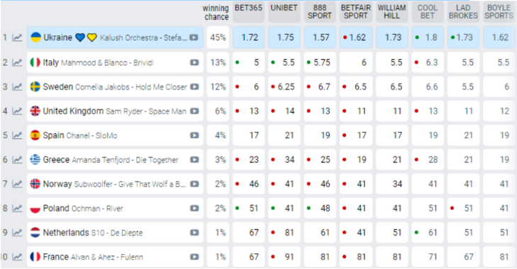 У вівторок, 10-го травня, відбудеться перший півфінал наймасштабнішого пісенного конкурсу «Євробачення-2022». Букмекери оновили прогнози на переможця. Про це повідомив Уніан. Раніше букмекери оцінювали перемогу України в 42%, а після двох репетицій українського гурту Kalush Orchestra ставки зросли ще на 1% – до 43%. За два дні до першого півфіналу «Євробачення» вони знову змінили свої ставки. Тепер Україні прогнозують перемогу з ще більшим відривом – 45%. На другому місці Італія, шанси якої оцінюються в 13%. Варто відзначити, що вокаліст гурту Kalush Orchestra Олег Псюк заявив, що Україна може перемогти в конкурсі не тільки через війну.
