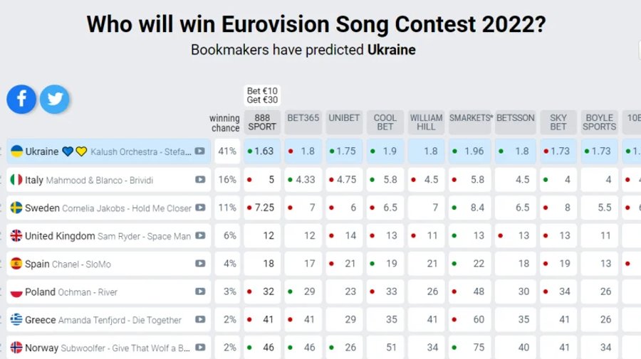 Про це повідомляє Суспільне. Українські музиканти й раніше очолювали рейтинг із 35%, але нині букмекери більш ніж упевнені в перемозі артистів.