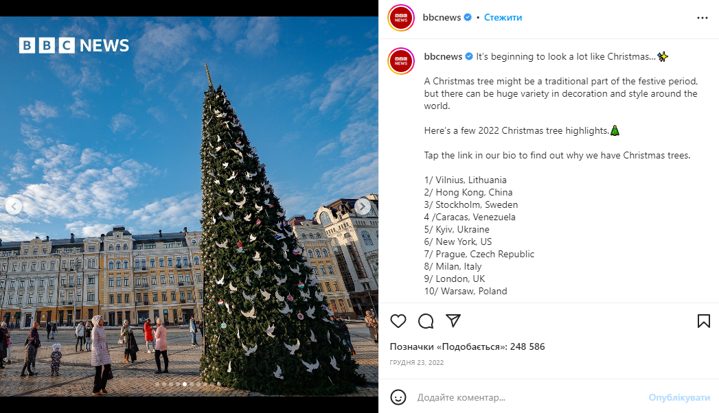 Рейтинг BBC News складають щорічно. Цього року київська ялинка особлива – вона стала символом незламності усіх українців.