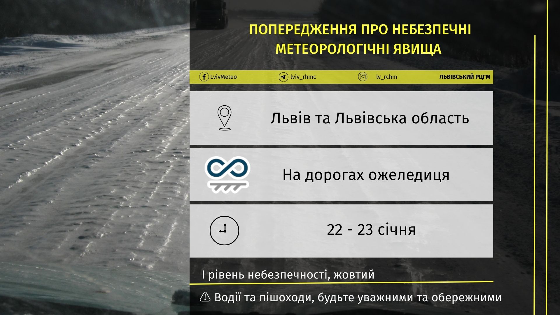 Крім того, у Львівському регіональному центрі з гідрометеорології попередили про небезпечні метеорологічні явища. Зокрема, 22-23-го січня – на дорогах ожеледиця. А це означає – перший рівень небезпечності, жовтий.