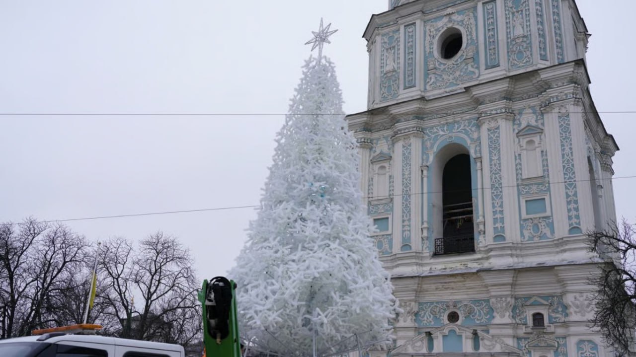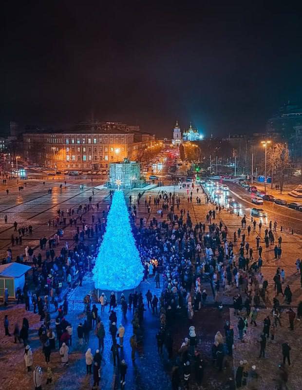 Про це повідомив міський голова Києва Віталій Кличко. Нова штучна ялинка має висоту 15 метрів, що на три метри більше за минулорічну. Її чистий білий колір уособлює світлий шлях оновлення та надію на краще майбутнє, що символізують Різдво Христове та Новий рік. Прикрасили ялинку світло-блакитною гірляндою завдовжки 2 км, яка ніжно огортає дерево своїм сяйвом. Окрім гірлянди, на ялинці розмістили 2000 бірюзових іграшок, що гармонійно доповнюють загальну концепцію дизайну. Цього року, як і минулого, всі витрати на встановлення та прикрашання головного символа свят профінансували меценати. Дизайн ялинки створює гармонійний ансамбль із величним фасадом Софійського собору. Поруч із деревом облаштовано фотозону «Крила Фенікса» – символ відродження та незламності. Церемонія запалення вогнів мала нагадати всім про важливість єдності, підтримки та оптимізму в ці складні часи. Мер Києва Віталій Кличко, привітавши українців із Днем Святого Миколая, закликав усіх зберігати віру, допомагати воїнам та продовжувати працювати задля перемоги.