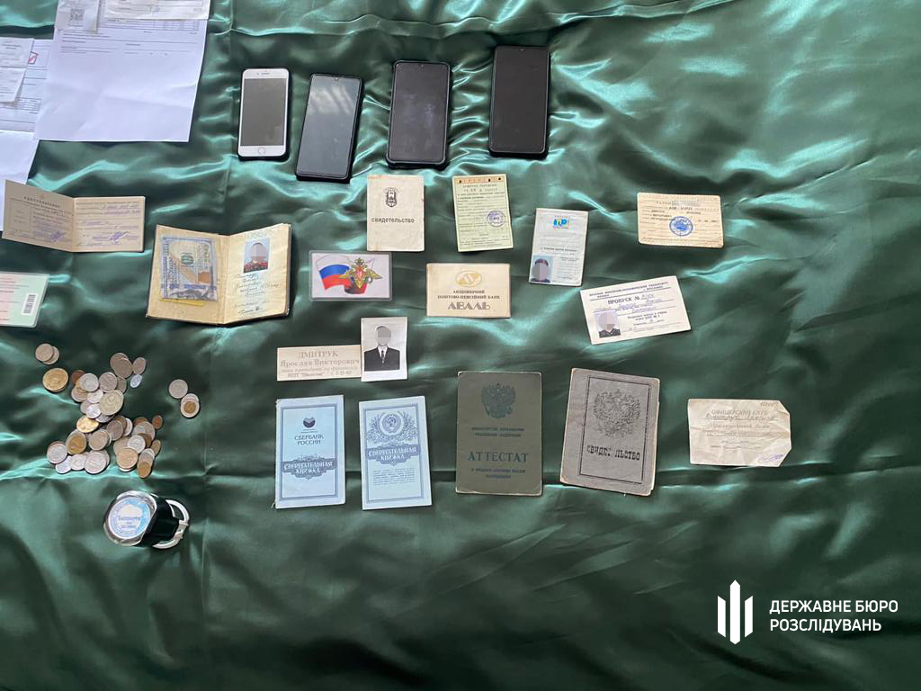 «Також під час обшуків вилучили 3,5 тисячі доларів, атрибутику Російської Федерації (монети, документи про здобуття освіти у РФ), одяг з емблемами СРСР та Росії, посвідчення офіцера МО СРСР, а також значки, кокарди та навіть георгіївська стрічка», – пояснили у ДБР.