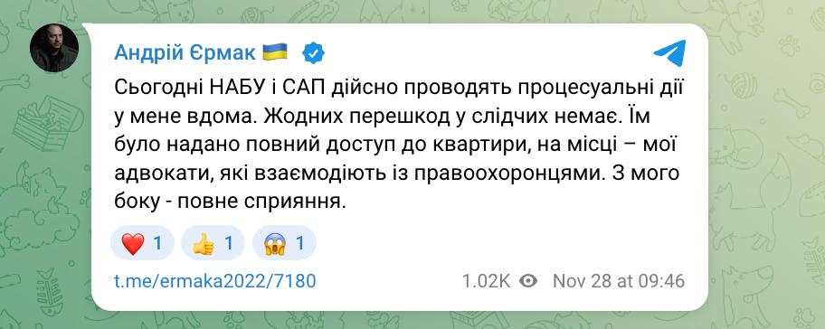 За інформацією «Української правди», на територію урядового кварталу зайшли близько десяти співробітників антикорупційних органів. Згодом у НАБУ та САП підтвердили факт проведення обшуків. Сам Андрій Єрмак також підтвердив цей факт, заявивши про повне сприяння органам.