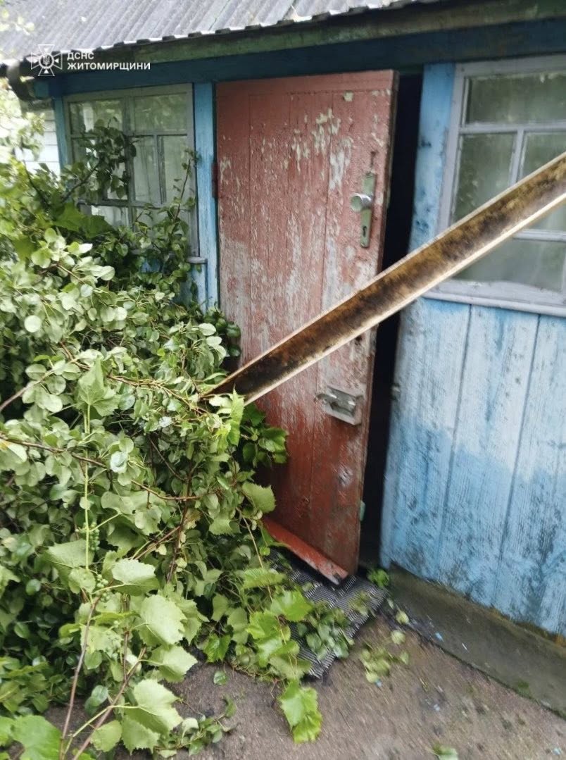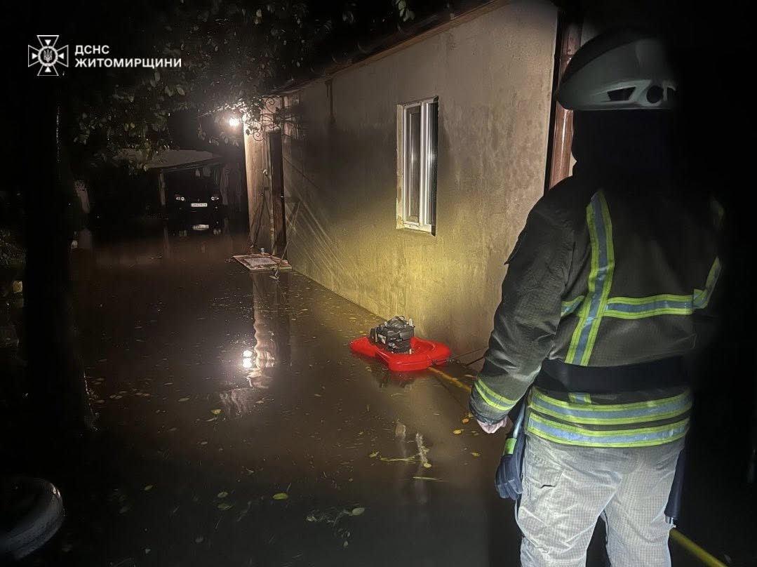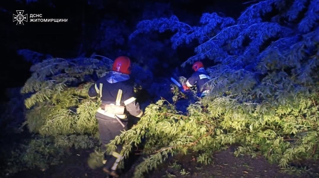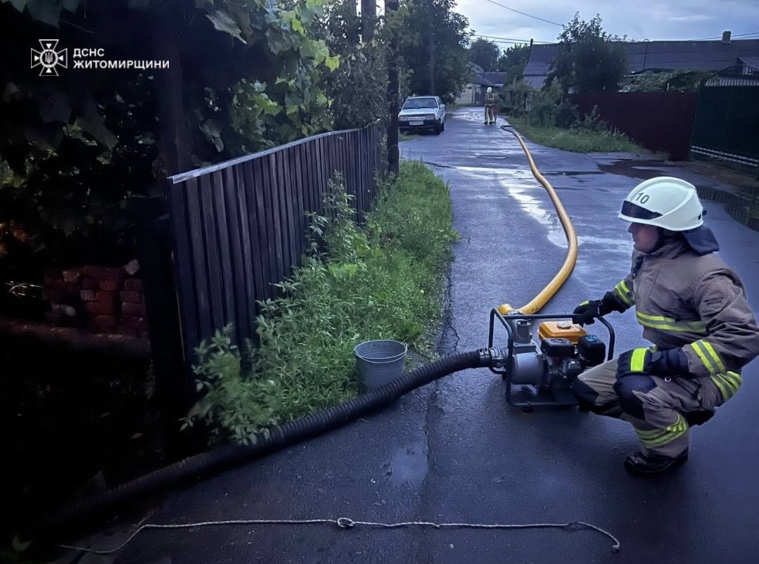 У місті Звягель на Житомирщині через рясні дощі затопило двори, підвали та житлові будинки. Рятувальники за добу відкачали понад 490 кубометрів води й прибрали 48 повалених дерев. У селі Турчинка через дерево, що впало, було заблоковано вхід до приватної оселі — прохід розчистили за допомогою спецінструментів.