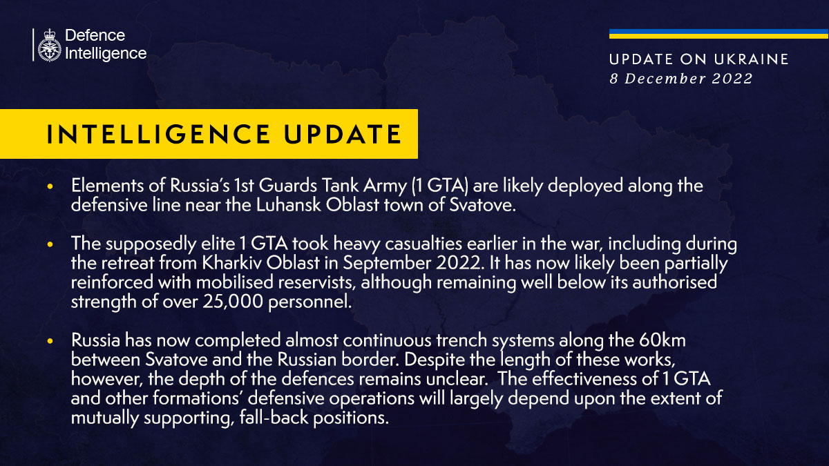 Російські загарбники використовують 1-шу гвардійську танкову армію, яка зазнала значних втрат під час відступу з Харківщини у вересні 2022-го року, для оборони Сватового на Луганщині. Про це повідомило Міністерство оборони Великої Британії з посиланням на дані розвідки.