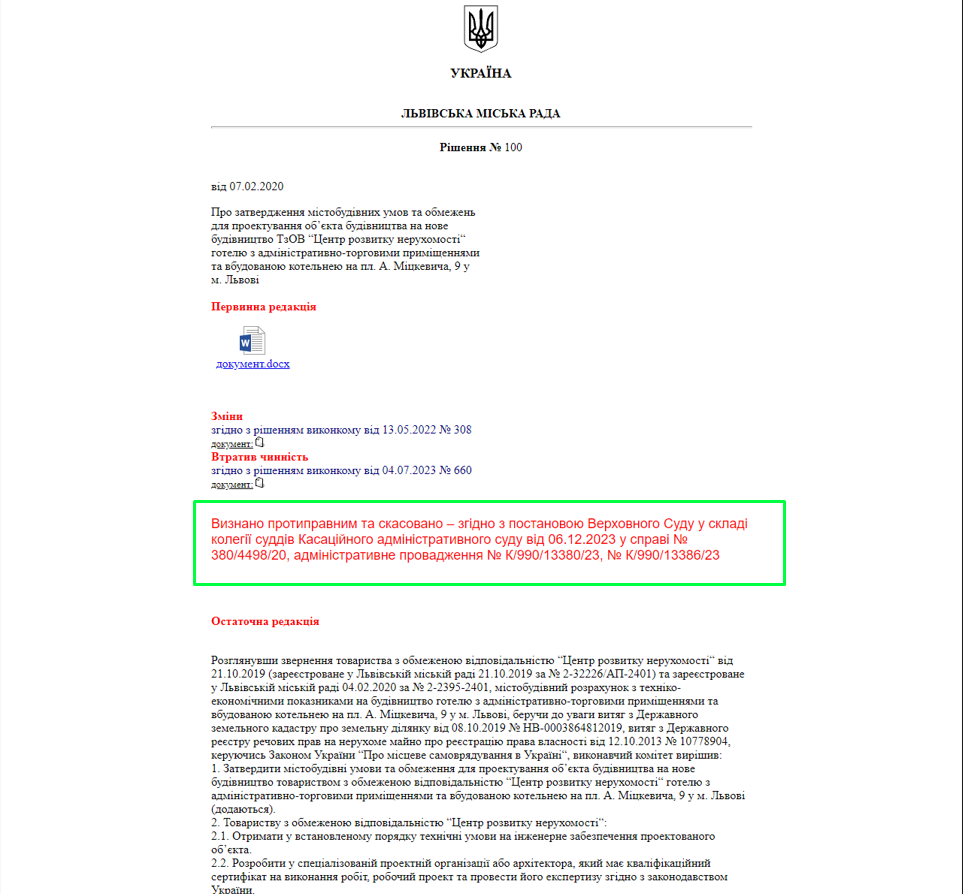 За останній рік керівництво управління охорони історичного середовища Львівської міської ради двічі ловили на хабарях. І з кожним новим викриттям корупціонерів видається, що місцева влада піклується не стільки за місто і громаду, як за інтереси конкретних осіб. Показовим прикладом стала історія будівництва готелю на площі Міцкевича, у зоні спадщини ЮНЕСКО, де діють суворі правила і значні обмеження. На додачу, ще є рішення Верховного суду на скасування документів, що дозволяють вести будівництво. Але міська влада не лише ігнорує слово Феміди, а й відверто, без жодного сорому, допомагає забудовнику обійти всі існуючі заборони. 6 грудня 2023 року Верховний Суд України скасував рішення Львівської міськради про затвердження містобудівних умов та обмежень для будівництва готелю на площі Міцкевича та фактично визнав зведення готелю у центрі міста незаконним. (13, 14)