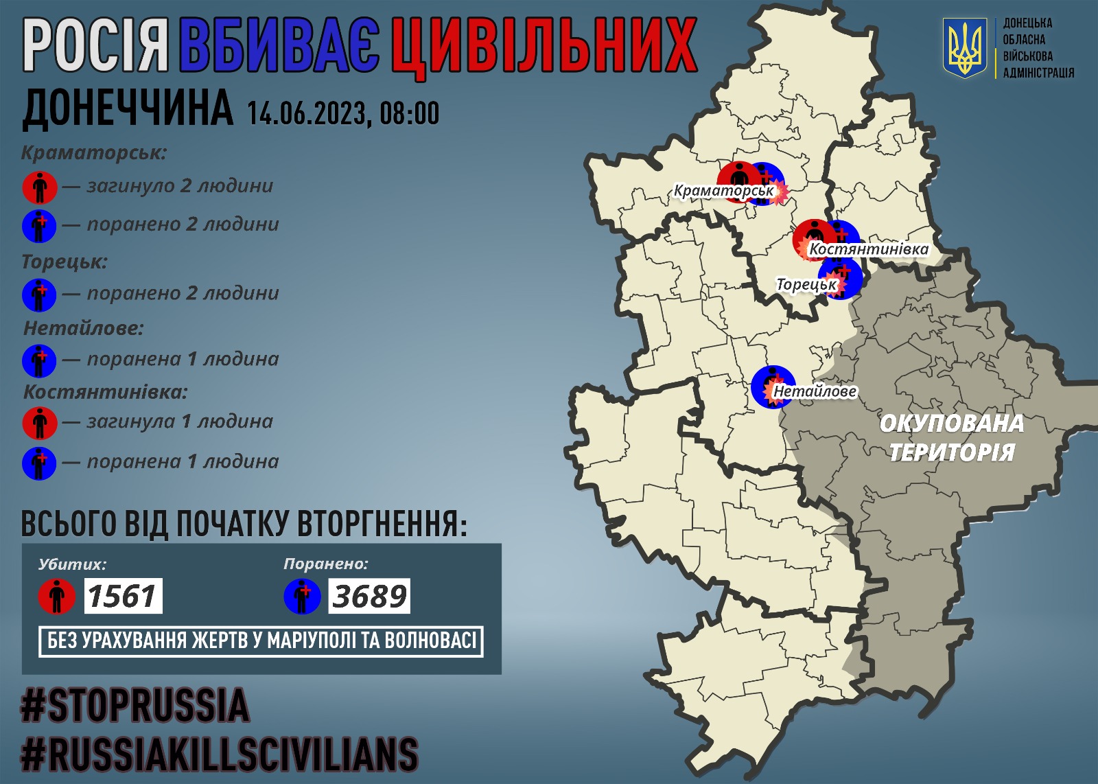 Троє людей загинули і трьох поранено після обстрілу Краматорська та Костянтинівки Донецької області. Рашистська атака відбулася зранку в середу, 14-го червня. Про це повідомив голова Донецької обласної військової адміністрації Павло Кириленко.