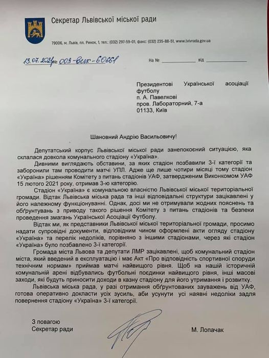 «Але дивує, чому керівники УАФ не звернулися з попередженням до стадіону, якщо мали якісь претензії до нього. Все зробилося якось кулуарно. Саме тому ми з колегами підготували текст звернення, щоб все-таки футбольні функціонери назвали ті речі, які потрібно виправити, щоб «Україні» повернули рівень кваліфікації. Ми також готові долучитися до виправлення ситуації, адже розвиток спортивної інфраструктури – це спільний пріоритет, який поза політикою, поза дискусіями», - заявив Маркіян Лопачак.