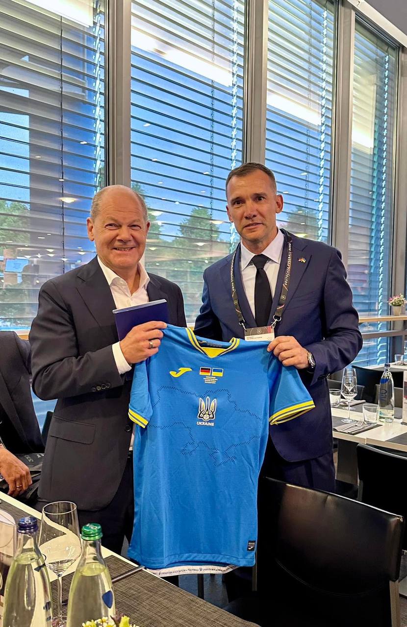 А президент Української асоціації футболу Андрій Шевченко скористався можливістю та зустрівся з канцлером Німеччини Олафом Шольцом, який теж завітав на футбол.